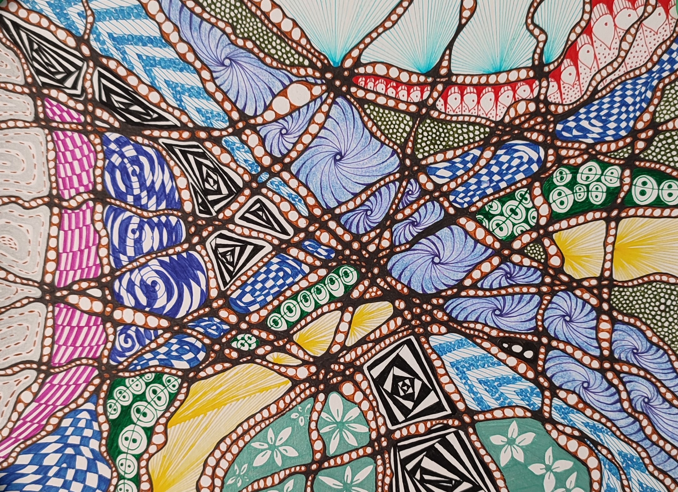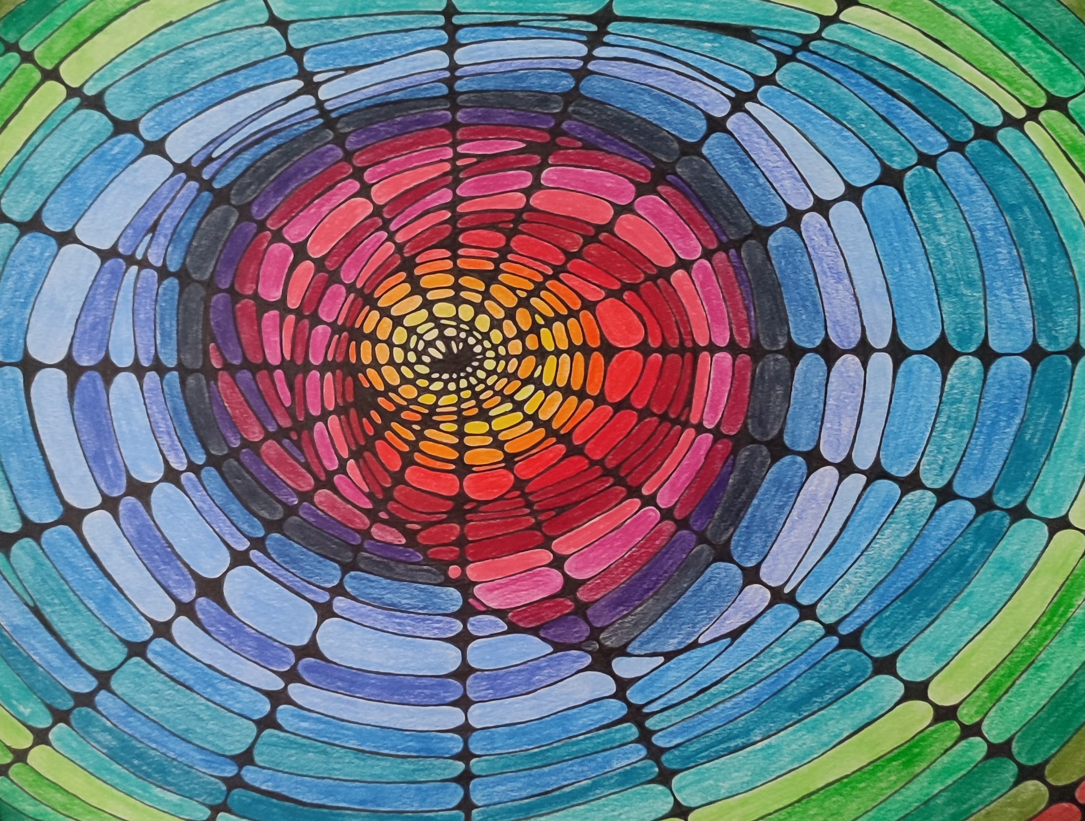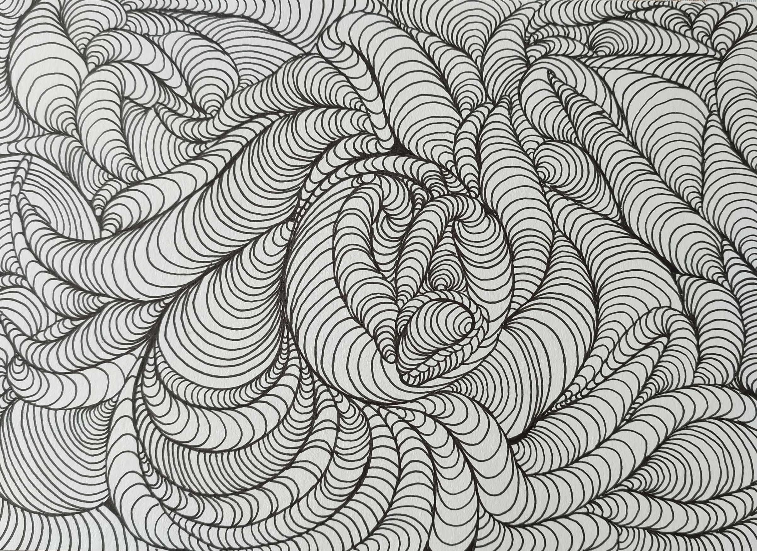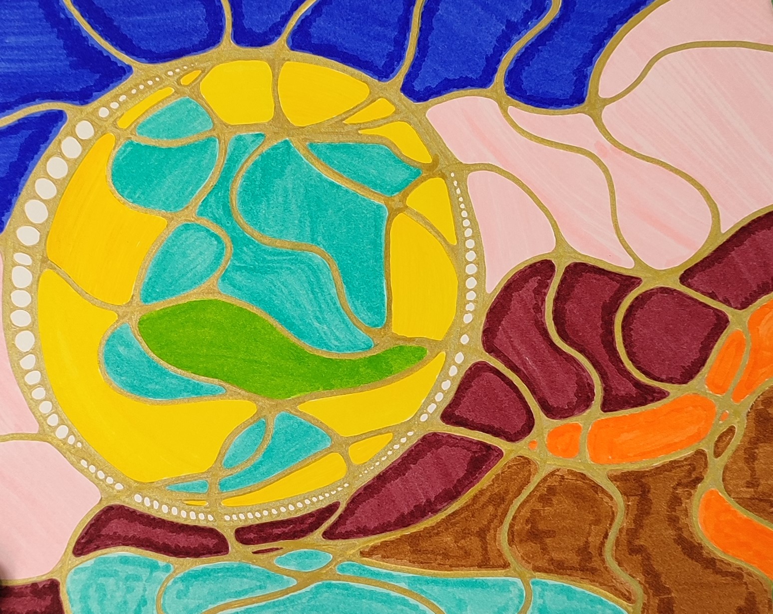 We vertrekken vanuit lijnen en cirkels. We nemen de hoeken weg uit de tekening, wat rust veroorzaakt, en de tekening een meditatief karakter krijgt. Het inkleuren gebeurt met kleuren, stift, verf, puur op gevoel. De kleuren bepalen de energie van de tekening. (Mandala) dot painting.