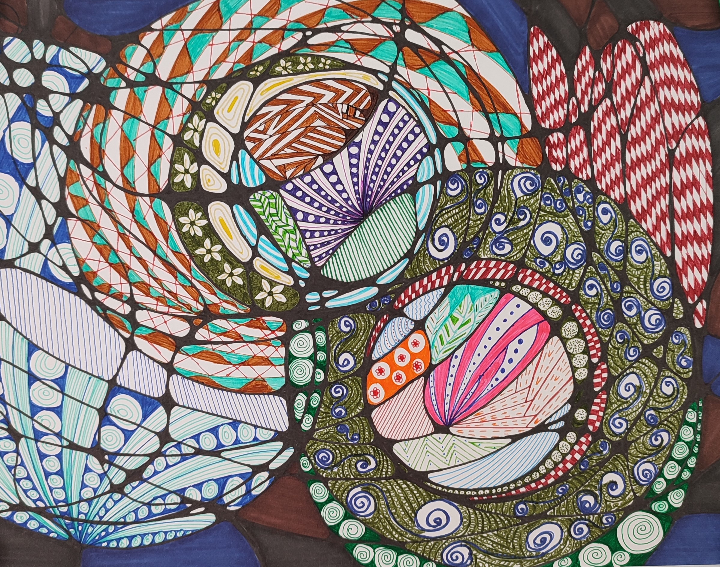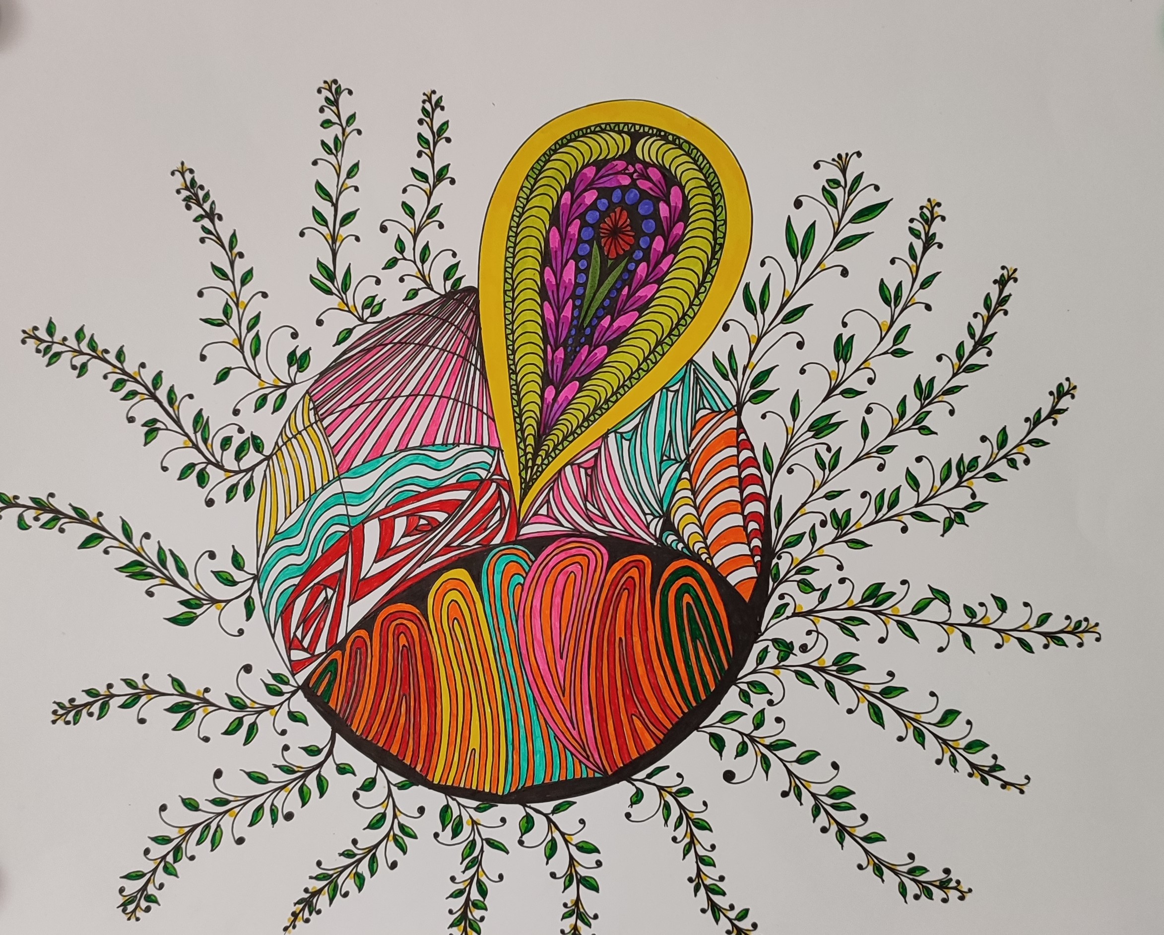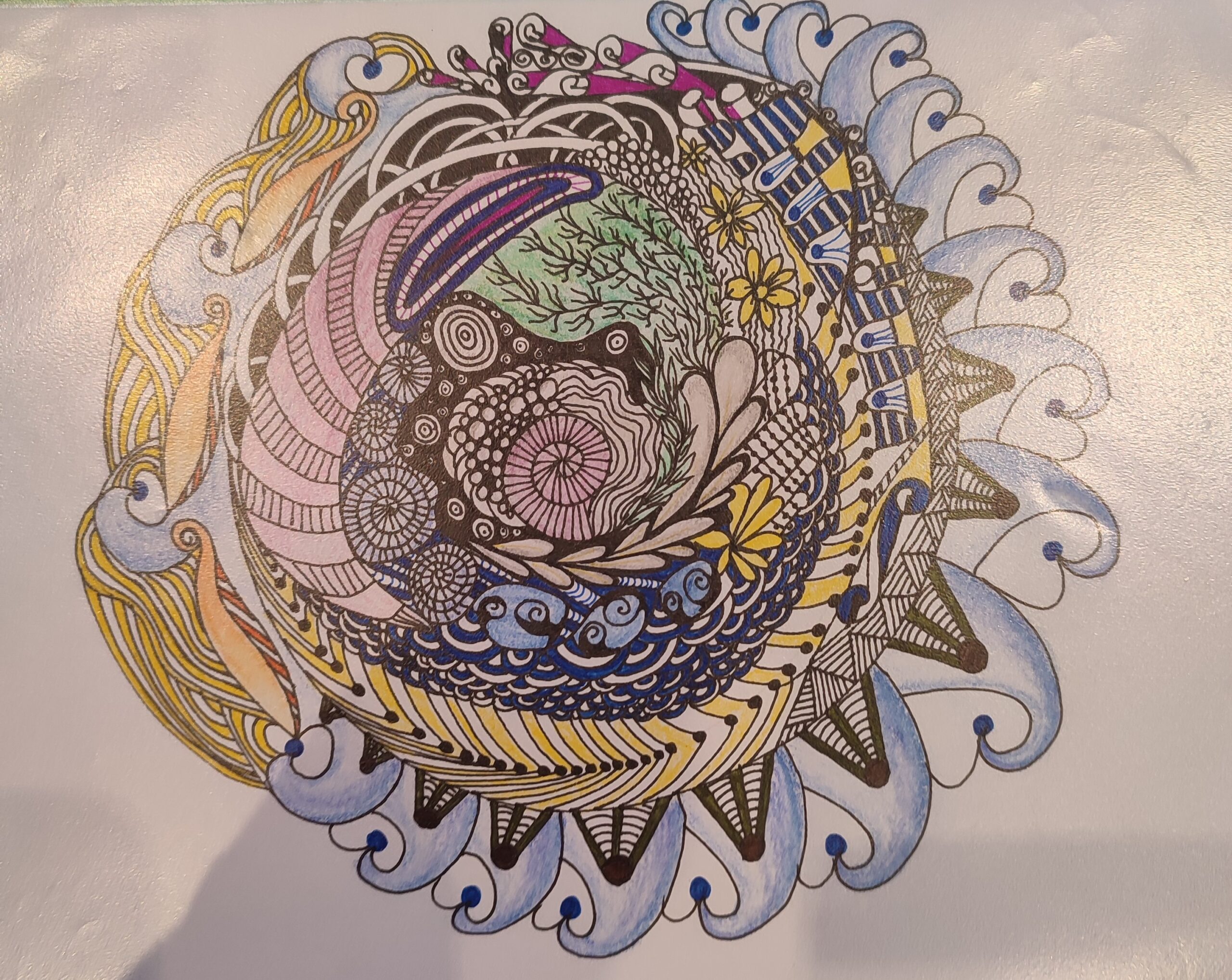 We vertrekken vanuit lijnen en cirkels. We nemen de hoeken weg uit de tekening, wat rust veroorzaakt, en de tekening een meditatief karakter krijgt. Het inkleuren gebeurt met kleuren, stift, verf, puur op gevoel. De kleuren bepalen de energie van de tekening. (Mandala) dot painting.