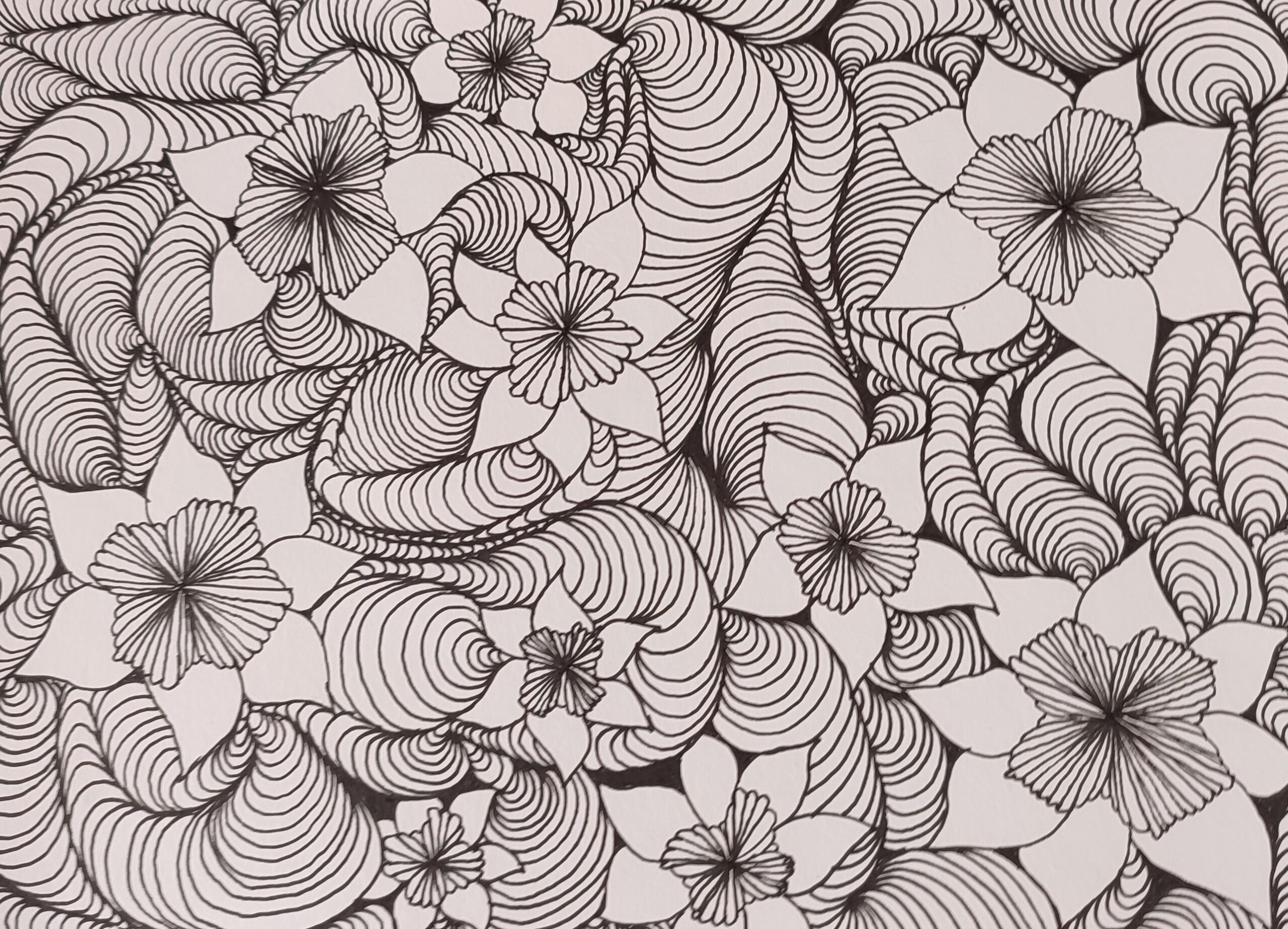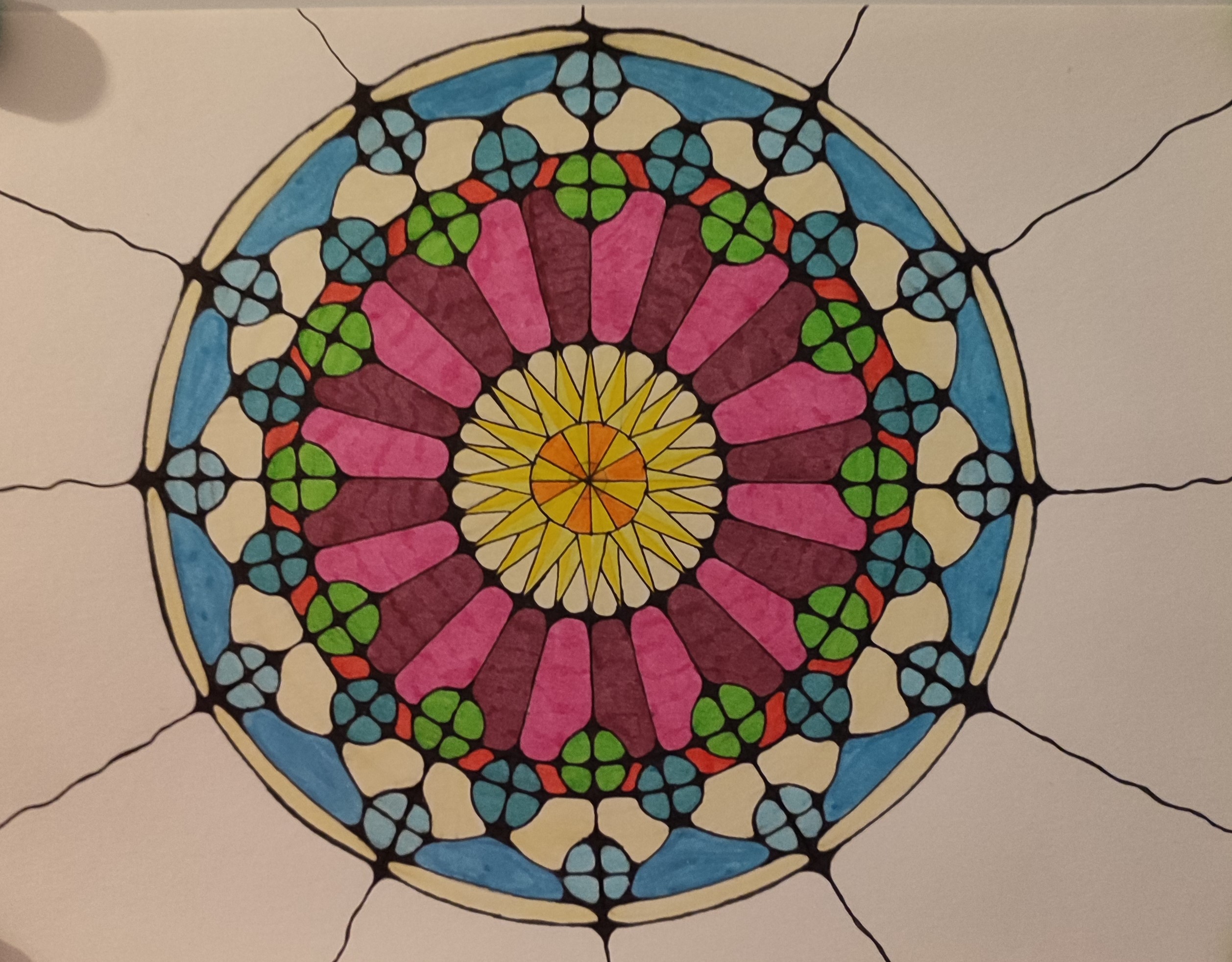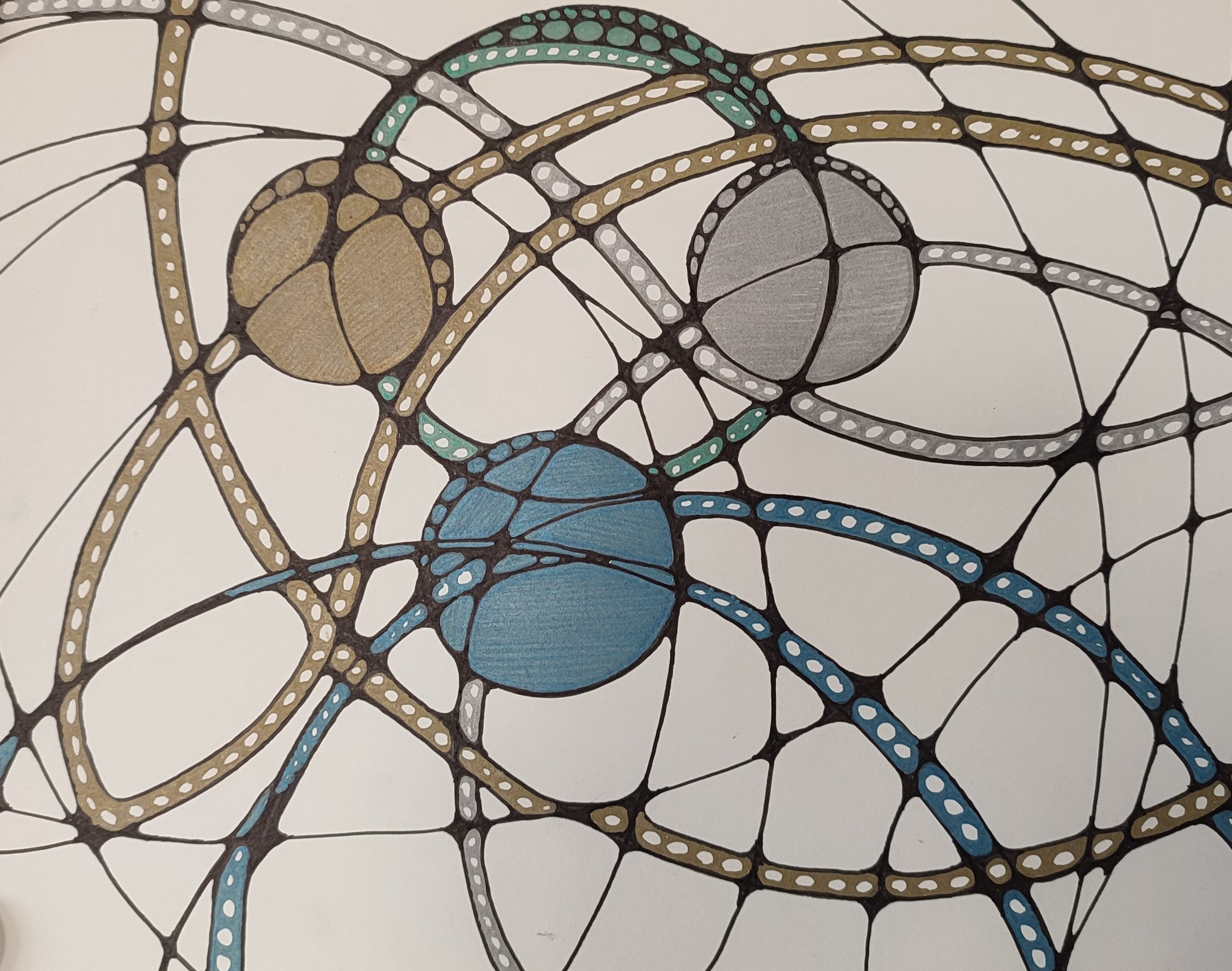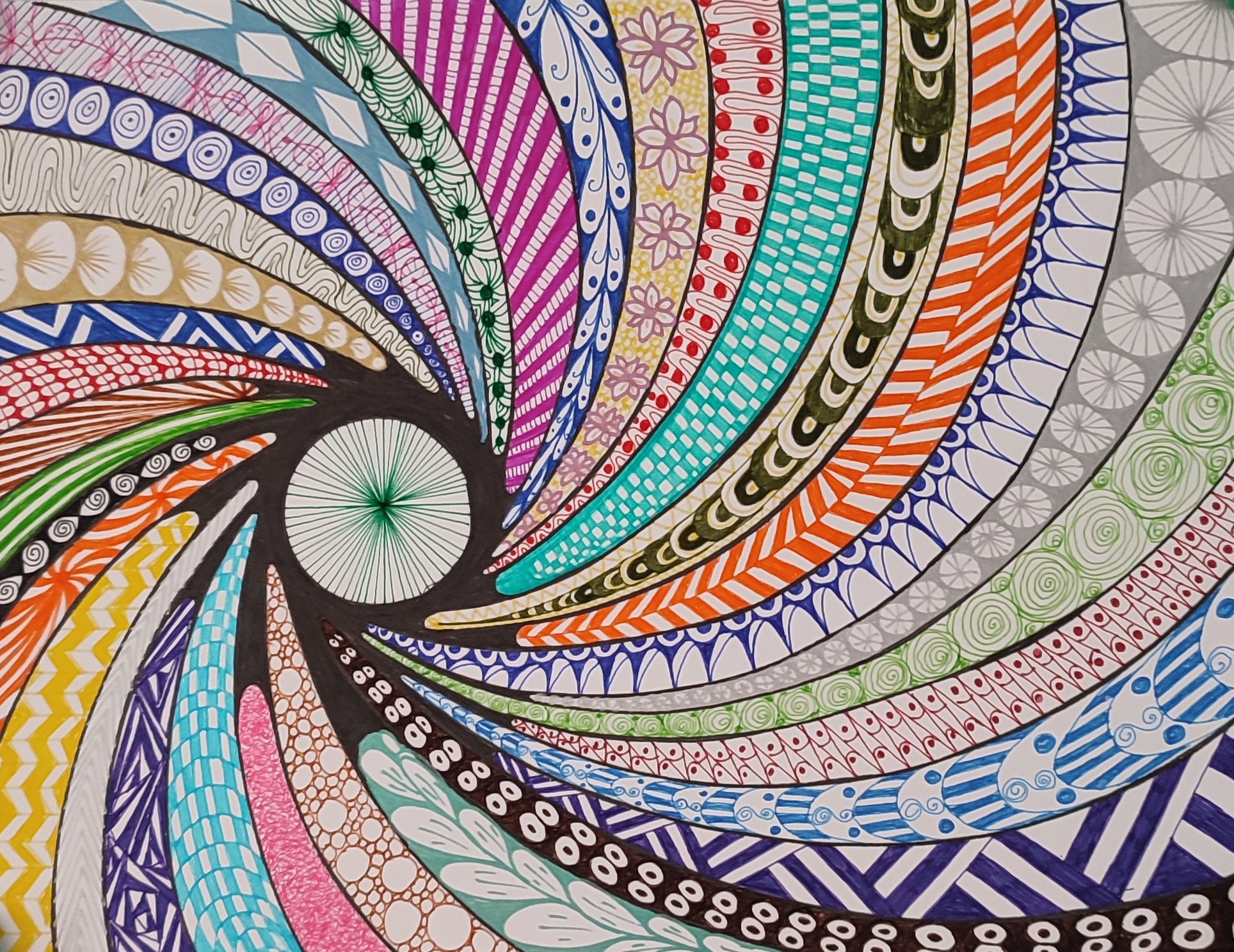 We vertrekken vanuit lijnen en cirkels. We nemen de hoeken weg uit de tekening, wat rust veroorzaakt, en de tekening een meditatief karakter krijgt. Het inkleuren gebeurt met kleuren, stift, verf, puur op gevoel. De kleuren bepalen de energie van de tekening. (Mandala) dot painting.